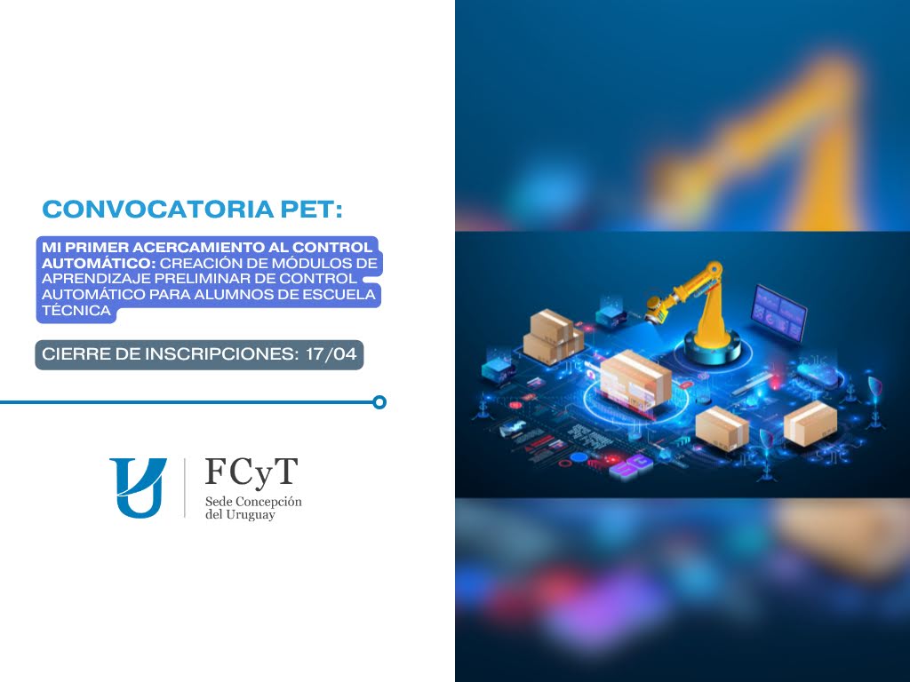 La Facultad de Ciencia y Tecnología, Sede Concepción del Uruguay, informa que se encuentra abierta la convocatoria para participar de la Práctica Educativa Territorial (PET) denominada “Mi primer acercamiento al control automático: Creación de módulos de aprendizaje preliminar de control automático para alumnos de escuela técnica”.