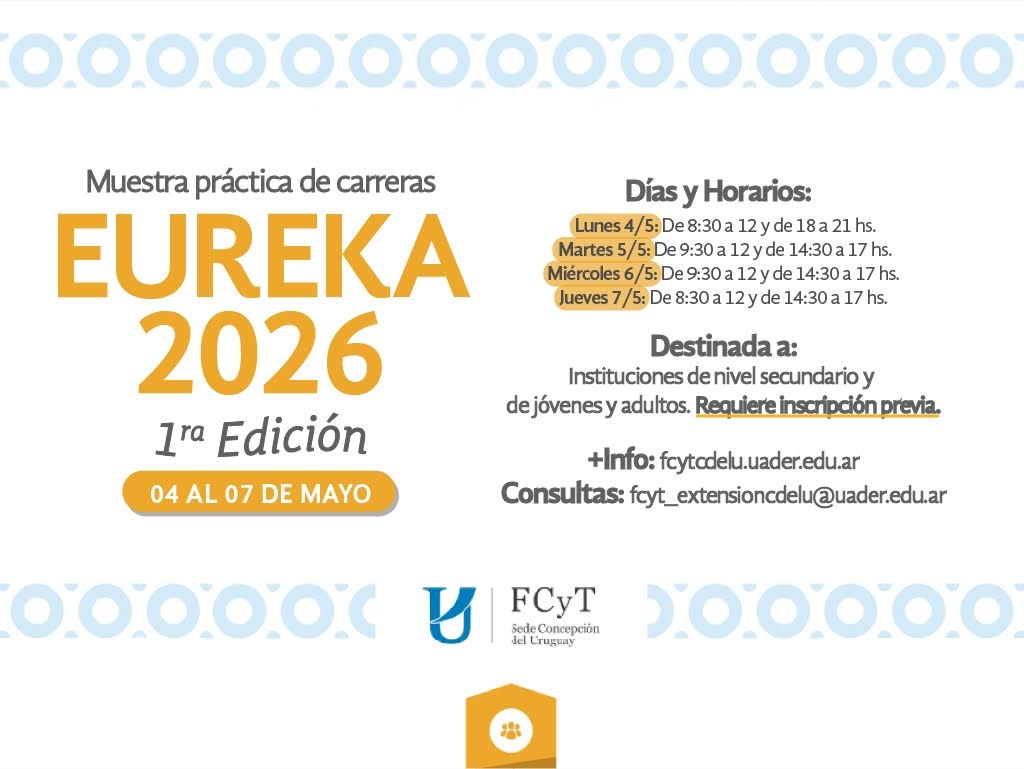 La Facultad de Ciencia y Tecnología, a través de su Secretaría Bienestar Estudiantil, organiza la Muestra Práctica de Carreras "EUREKA 2026: Entre Costas". La propuesta está destinada a estudiantes que se encuentren transitando los dos últimos años de nivel secundario de instituciones públicas y privadas de la provincia de Entre Ríos, así como también para público en general interesado en la temática.